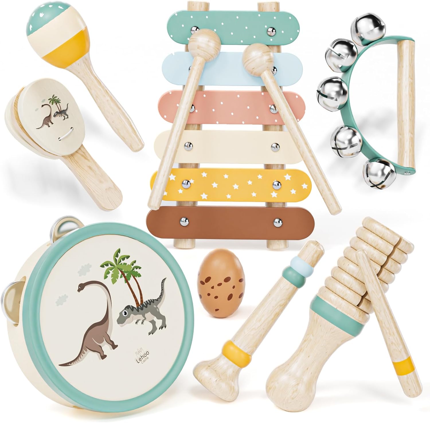 - STYLISH & PORTABLE: Our instruments are designed with a soft Morandi color palette and a unique dinosaur theme that is appealing to babies and toddlers. Comes with a drawstring storage bag making this set practical for use at home or on the go