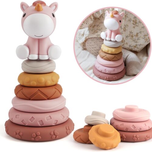 - Safe Teething Material – BPA free, non-toxic, high quality material using makes the product durable and safe. Our toys are super soft for assisting your babies while they are teething. Each of them has a small hole, baby’s teething and enjoys the squeaky noise by biting them, great sensory chew toys and stacking toys for toddlers 1-3.
