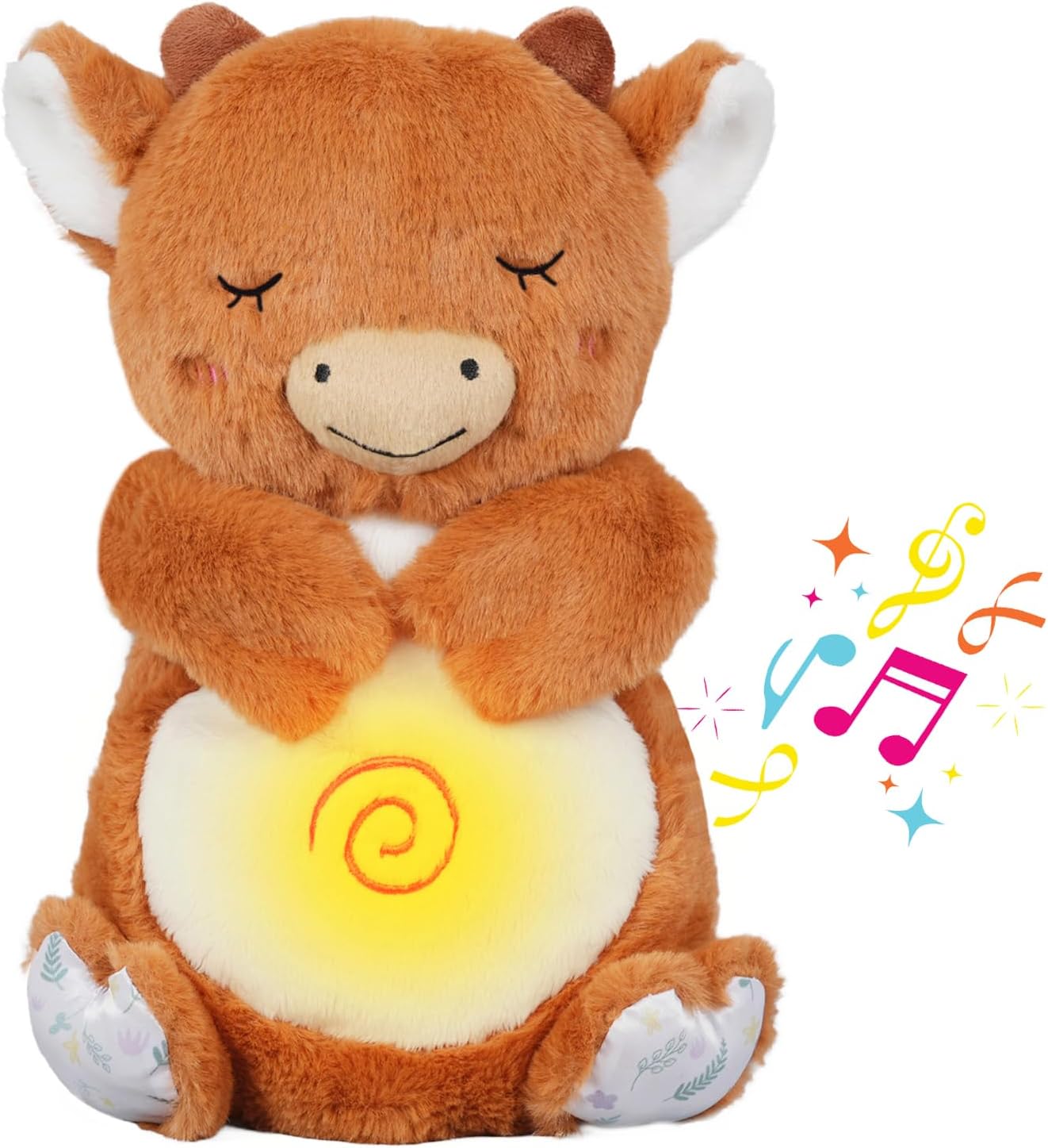 - SELF LUMINESCENT: The breathing stuffed animal cow doll tummy can be lit up with soft lights, perfect for accompanying your kids while he sleeps, making him feel at ease and helping him to enter a sweet dreamland
