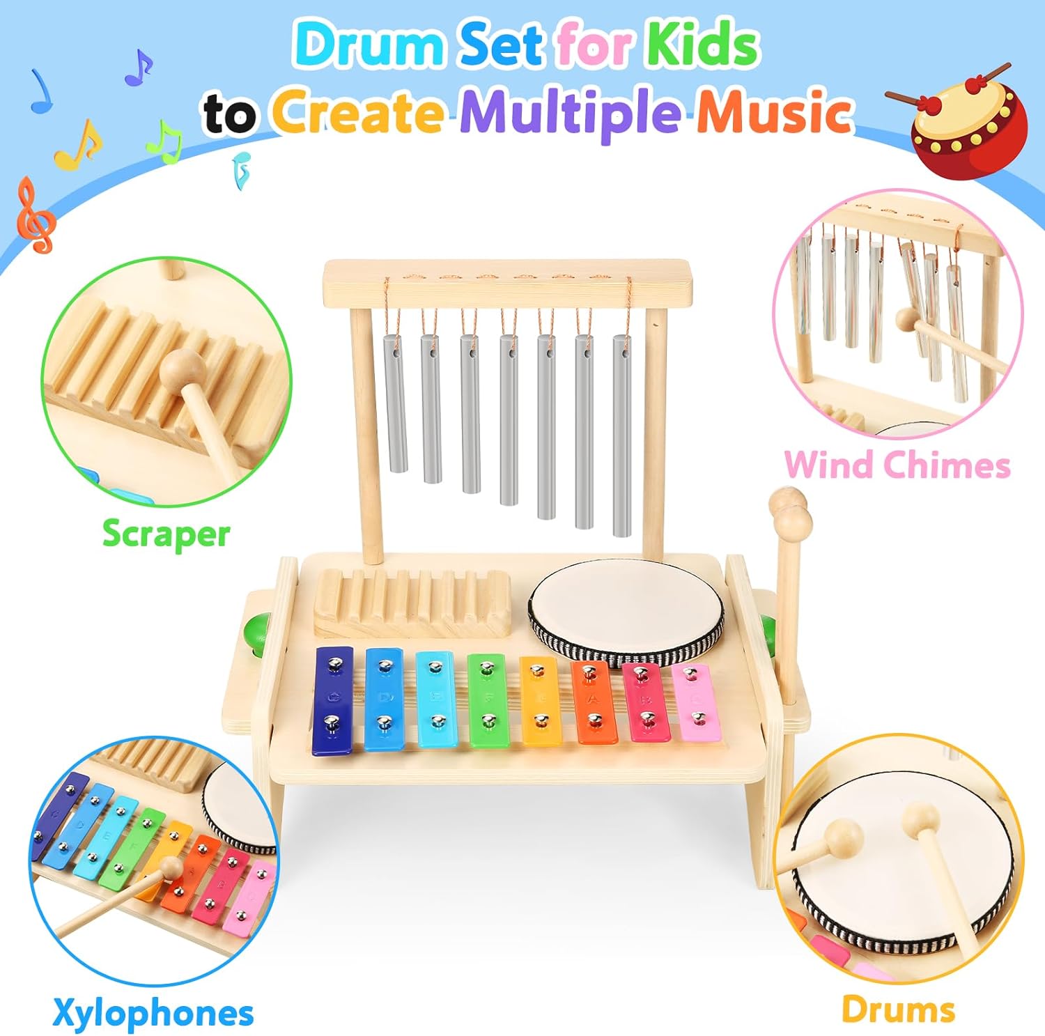 Kids Drum Set,Baby Musical Instrument for Toddler,Wooden Xylophone for Toddlers with Baby Drum Set and Wind Chime,Montessori Musical Instruments Toys for Kids,Musical Toys for Toddlers Birthday Gift